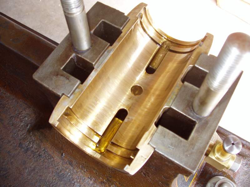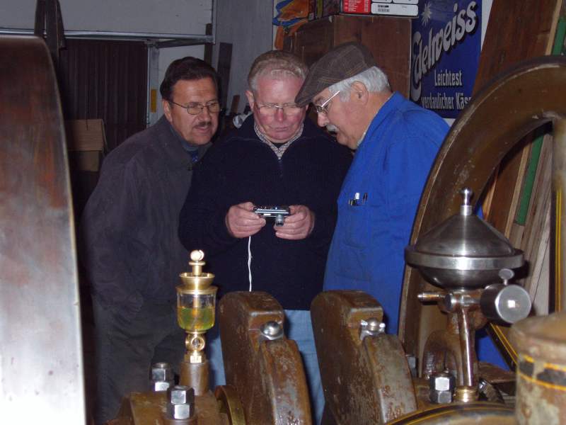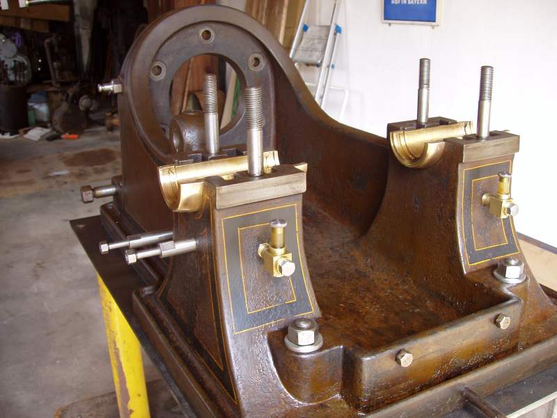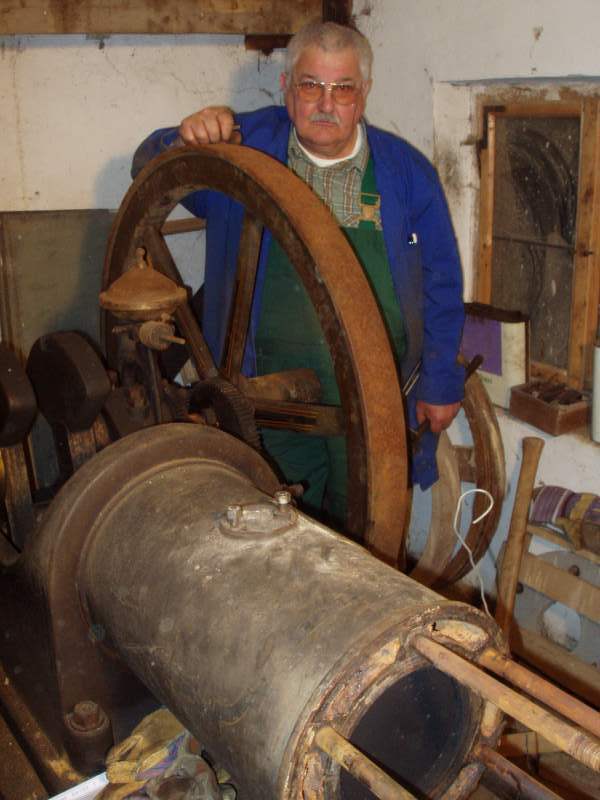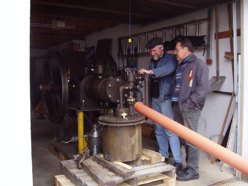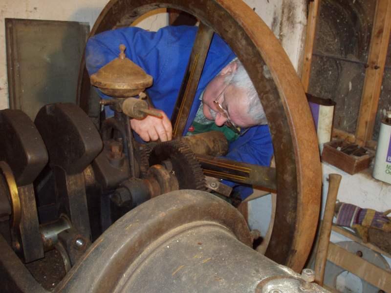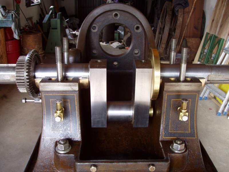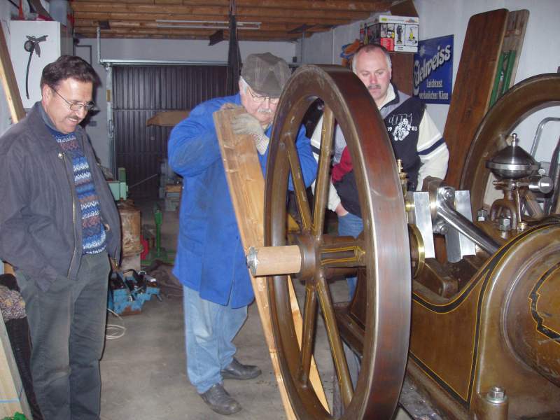 war. Noch erfreulicher war, dass fast alle Teile vorhanden und bis auf etwas Flugrost unversehrt waren. Die Maschine war ganz offensichtlich gut gepflegt worden; kein "Grobschmied" hatte im Lauf des letzten Jahrhunderts Schrauben und Muttern mit einer Rohrzange traktiert, so dass ich nur sehr wenige (natürlich zöllige) Muttern nachfertigen musste. Dass der Motor in der Vergangenheit mit Bedacht und Sorgfalt behandelt worden war, zeigte sich auch daran, dass an einem Brett an der Wand noch alle originalen Schraubenschlüssel und kleinere Ersatzteile vorhanden waren! Überhaupt zeigte sich bei den meisten Teilen nahezu kein Verschleiß. Sowohl Kurbelwelle als auch deren Hauptlager sowie das Pleuellager wiesen nach genauer Vermessung keine Abnutzung auf, was natürlich auch auf die große Dimensionierung der Teile bei geringer Leistung (4 PS) zurückzuführen ist. Die Lackierung und Linierung waren stellenweise zwar rissig, aber größtenteils noch erhalten, weshalb ich keinen Augenblick lang zögerte, die Optik, so wie sie war, zu erhalten. Allein der Dreck der vergangenen 100 Jahre wurde vorsichtig entfernt. Alle blanken Teile, die schon werksseitig geschliffen waren, wurden mit Schleif- und Polierleinen bearbeitet. Nur wenige Teile mussten neu angefertigt werden: